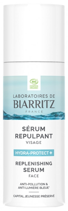 Hydra-protect+ Sérum Repulpant Visage Bio des Laboratoires de Biarritz est un booster d'hydratation multi-actions. Il apporte à la peau une hydratation intense pendant 24 h et une protection globale contre les agressions du quotidien : lumière bleue, pollution, stress, fatigue… La peau est ainsi plus lisse, plus éclatante et plus lumineuse.