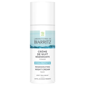 Hydra-protect+ Crème de nuit Régénérante Visage Bio des Laboratoires de Biarritz offre un effet "peau neuve" dès le réveil. En agissant la nuit, cette crème intensifie son action hydratante et accentue la protection globale de la peau. La peau est ainsi régénérée, défatiguée, souple et confortable.