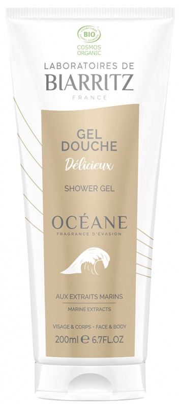 Océane Gel Douche Délicieux Bio des laboratoires de Biarritz, aux extraits marins, nettoie et élimine efficacement les impuretés de la peau du visage et du corps. Ce gel douche au parfum naturel et ensoleillé laisse la peau propre, douce et parfumée.