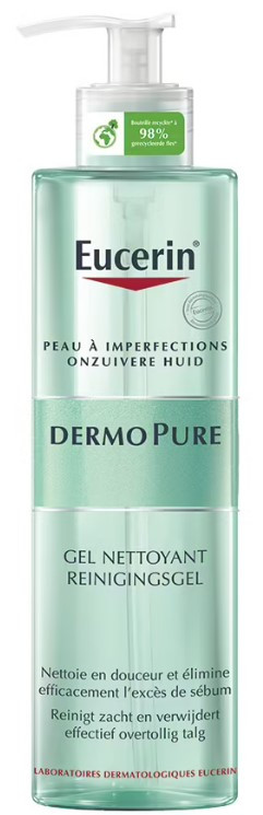 Dermo Pure Gel Nettoyant des laboratoires Eucerin est utilisé pour nettoyer et éliminer les impuretés incrustées dans la peau, dont les excès de sébum et les traces de maquillage. Il est conçu pour les peaux sujettes à l'acné, aux imperfections.