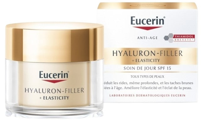 Hyaluron-Filler + Elasticity Thiamidol Soin de Jour SPF15 du laboratoire Eucerin est destiné à tous les types de peaux. Cette crème anti-âge réduit les rides, les taches brunes liées à l'âge tout en améliorant l'élasticité et l'éclat de la peau. De plus, elle apporte une protection contre les UV.
