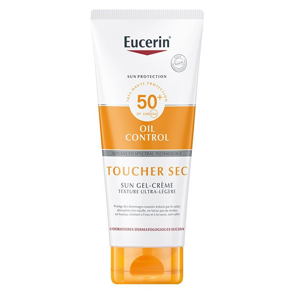 Le gel-crème toucher sec SPF 50+ Eucerin Sun Sensitive Protect est un produit qui permet de protéger sa peau du soleil et des effets néfastes de ses rayons. Il prévient les coups de soleil, provoqués par les UVB, ainsi que le vieillissement cutané prématuré et les lésions cellulaires.
