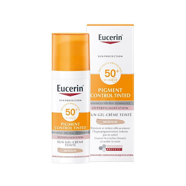 Le gel crème Eucerin Pigment Control Teinté SPF 50+ est un gel crème teinté (teinte médium) indiqué pour prévenir et corriger les taches pigmentaires liées au soleil. C’est pour se protéger et pour éviter l’apparition des taches brunes que le gel crème teinté Pigment Control de la marque Eucerin est indiqué.