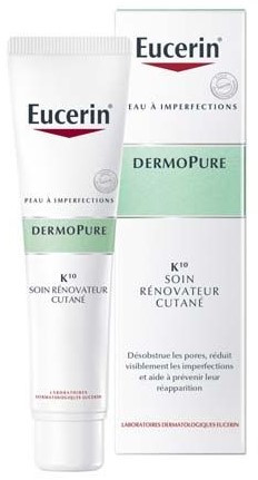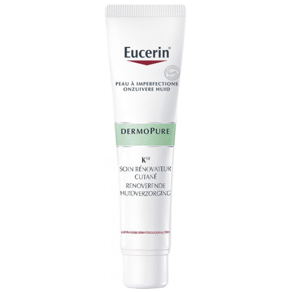 DermoPURE K10 Soin Rénovateur Cutané du laboratoire Eucerin est destiné aux peaux sujettes aux imperfections. À appliquer idéalement le soir, ce soin réduit visiblement les imperfections, aide à prévenir leur réapparition et désobstrue les pores.