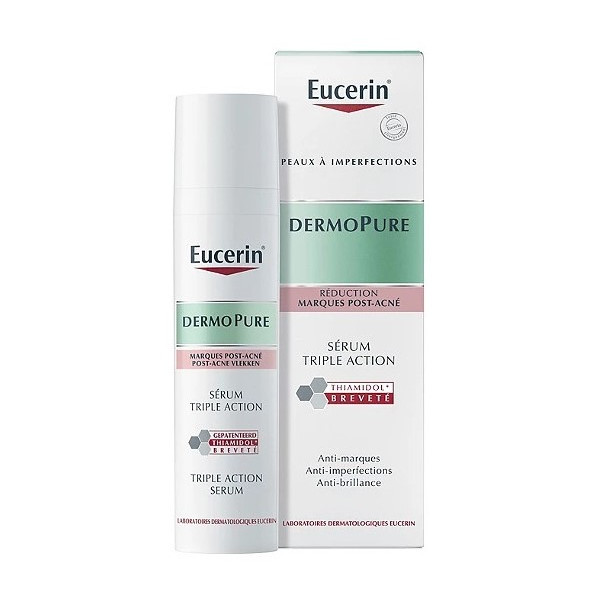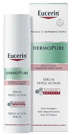 Améliorez votre routine de soin cutané avec le Sérum Triple Action DermoPure d’Eucerin qui se caractérise par une formule unique. Grâce au Thiamidol breveté, il cible efficacement les imperfections et les marques résiduelles. Il réduit également les brillances en seulement deux semaines d’application. Ce composant est utile en cas d’hyperpigmentation post-inflammatoire. Pour ce faire, il inhibe la production de mélanine afin d’atténuer les tâches liées aux marques post-acné.