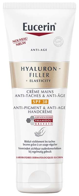 HYALURON-FILLER + ELASTICITY Crème Mains Anti-Taches et Anti-Âge SPF 30 est un produit des laboratoires Eucerin. Il s’agit d’un soin anti-âge pour les mains et convenant à tous types de peaux.