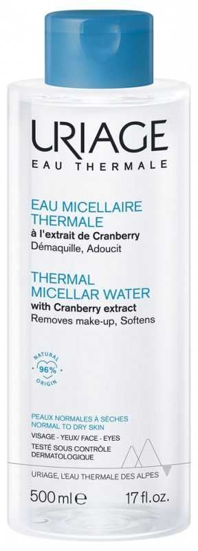 L'Eau Micellaire Thermale à l'extrait de Cranberry des laboratoires dermatologiques d'Uriage a été spécialement développé pour le démaquillage des peaux normales à sèches.