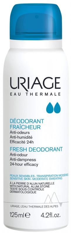 Le Déodorant Fraîcheur en aérosol d'Uriage lutte contre la transpiration et les odeurs des peaux sensibles avec une transpiration modérée. Ce déodorant a une efficacité de 24 h.