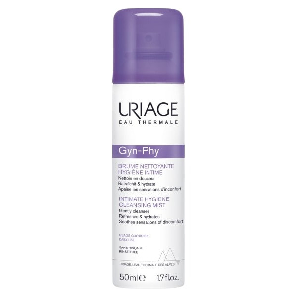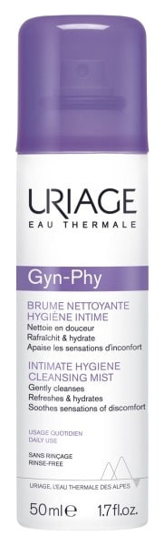 - Vaporiser directement Brume Nettoyante Gyn-Phy Hygiène Intime Uriage sur la partie externe de la zone intime.