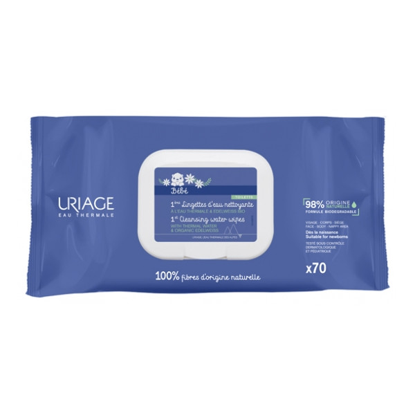 1ère Lingettes d'Eau Nettoyante d'Uriage Bébé est une lingette conçue avec 100 % de fibre d'origine végétale et à base d'Eau Thermale d'Uriage et d'Edelweiss Bio. Cette lingette sans rinçage nettoie en douceur les peaux délicates de bébé dès la naissance.