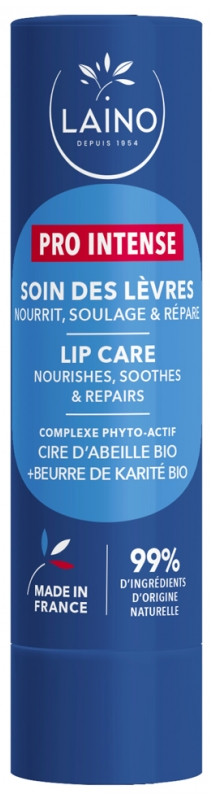 Le Stick Soin des lèvres Pro Intense de la marque Laino est formulé à base 99 % d'ingrédients d'origine naturelle dont de la Cire d'Abeille Bio et du Beurre de Karité Bio. Ce stick nourrit, soulage et répare efficacement les lèvres abimées ou sensibilisées.