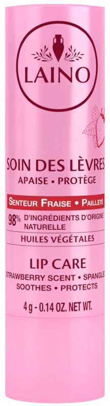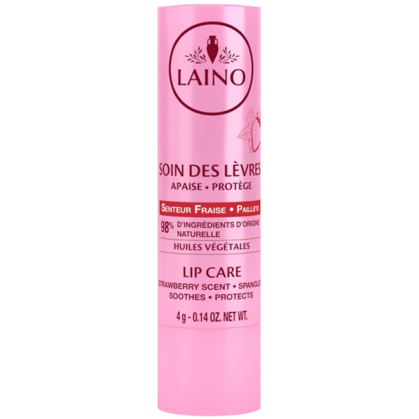 Le Stick soin des lèvres Fraise Pailleté de la marque Laino est formulé à base d'huiles végétales pour apaiser et protéger les lèvres fragilisées.