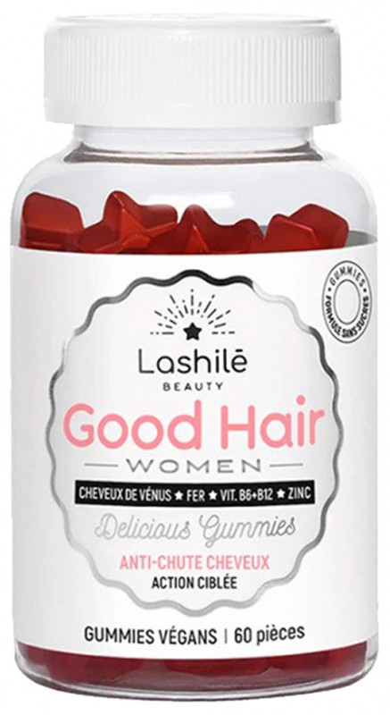 Les gummies Lashilé beauty, des gommes en forme d'étoile, ont été développés pour faciliter la prise de complément alimentaire. Les gummies Good Hair Women Anti-chute de Cheveux sont vitaminés et formulés avec des actifs nécessaires pour prévenir et limiter la chute des cheveux.