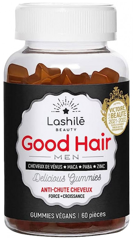 Les Gummies Good Hair Men du laboratoire nutricosmétique français Lashilé Beauty sont des gummies vitaminés, en forme d'étoile, destinés à traiter les chutes des cheveux des hommes. Ce sont des produits Vegan, non testés sur les animaux. Ces gummies ont l'avantage d'être facile à prendre et à digérer.