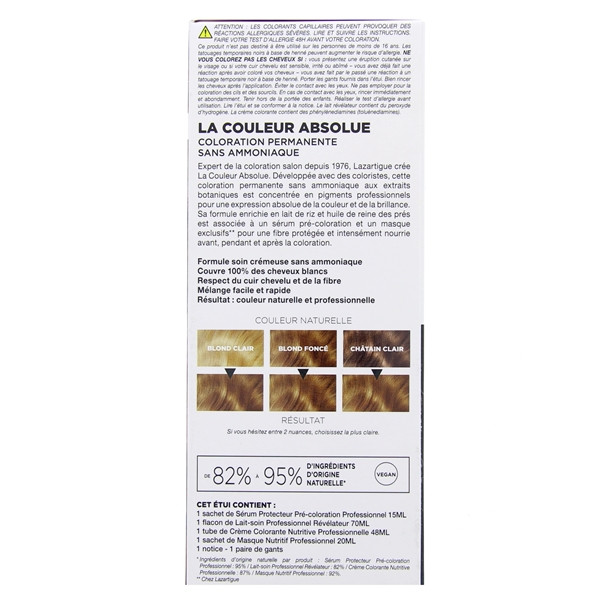 - Avant d’employer La Couleur Absolue 6.30 Blond Foncé Doré Lazartigue, bien lire la notice et se conformer aux instructions. Ne pas oublier de réaliser un test d’allergie 48 heures auparavant.