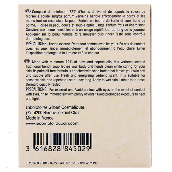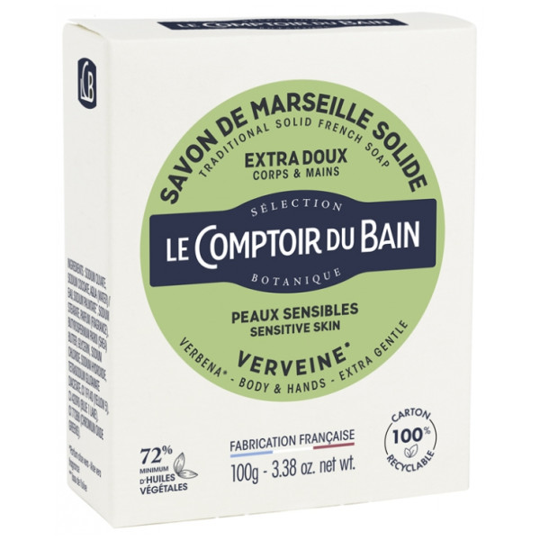 Le Savon de Marseille Solide Extra Doux Verveine de la marque Le comptoir du Bain nettoie efficacement et tout en douceur les peaux sensibles du corps et des mains.