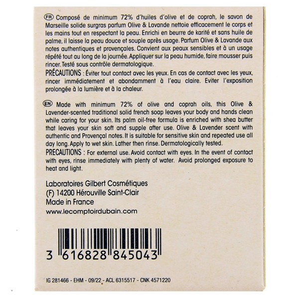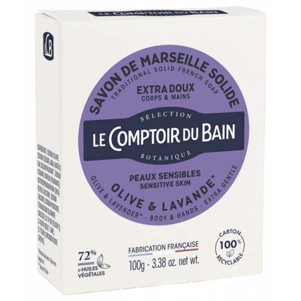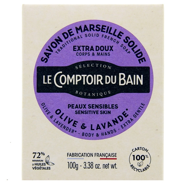 Le Savon de Marseille Solide Extra Doux Olive Lavande de la marque Le comptoir du Bain nettoie efficacement le corps et les mains tout en respectant la peau. Il est idéal pour les peaux sensibles. Ce savon aux parfums d'olive et de lavande vous plonge directement dans un champs provençal.