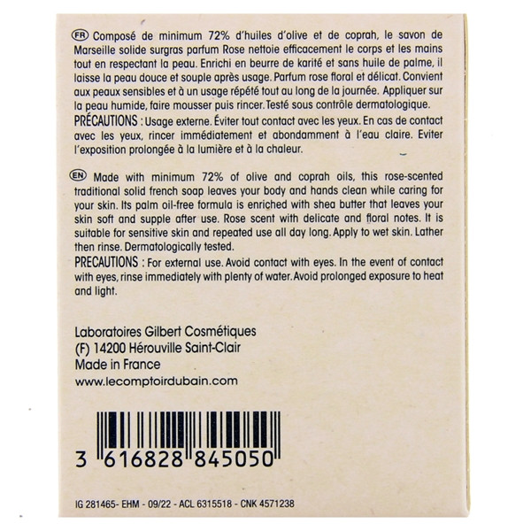 Le Savon de Marseille Solide Extra Doux Rose de la marque Le comptoir du Bain nettoie efficacement la peau sensible du corps et des mains tout en la respectant. Ce savon laisse un parfum délicat de rose sur la peau.