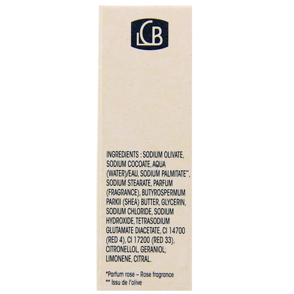 Sodium Olivate, Sodium Cocoate, Aqua (Water)/Eau, Sodium Palmitate*, Sodium Stearate, Parfum (Fragrance), Butyrospermum Parkii (Shea) Butter, Glycerin, Sodium Chloride, Sodium Hydroxide, Tetrasodium Glutamate Diacetate, CI 14,700 (Red 4), CI 17,200 (Red 33), Citronellol, Geraniol, Limonene, Citral.