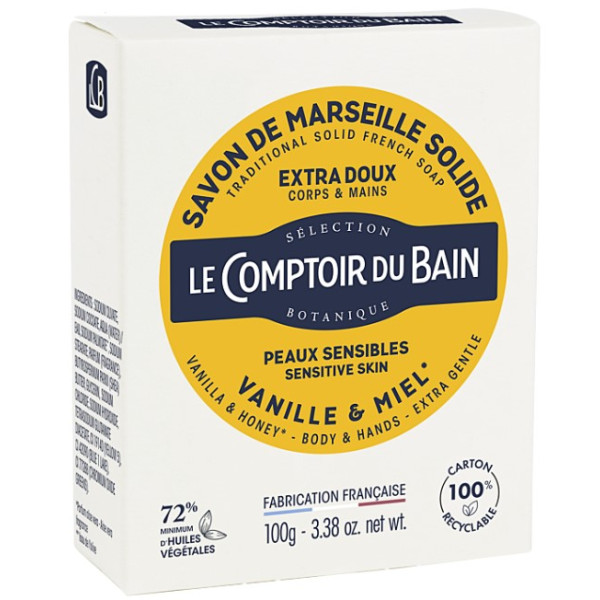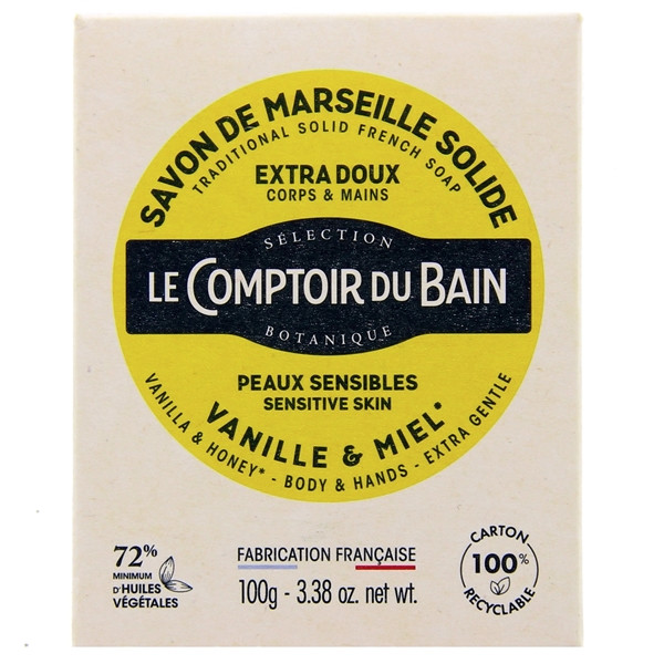 Le Savon de Marseille Solide Extra Doux Vanille Miel de la marque Le comptoir du Bain nettoie efficacement et en douceur les peaux sensibles du corps et des mains. De plus, il laisse sur la peau un parfum gourmand et épicé de vanille et de miel.