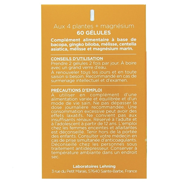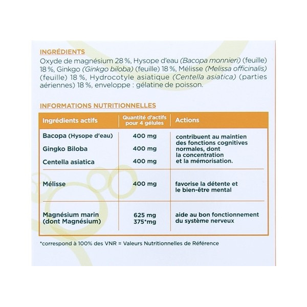Il s’agit d’un complément alimentaire naturel composé d’une formule qui associe le Bacopa monnieri, le Ginkgo biloba, la Centella asiatica, la Mélisse officinalis et le magnésium. Cet ensemble d’actifs soutient les fonctions cognitives, surtout en période d’examen ou d’épisodes de surmenage professionnel. Ils favorisent la concentration et la mémorisation.