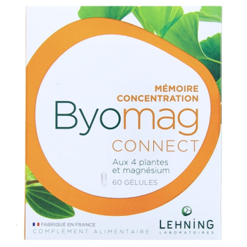 Byomag Connect est un complément alimentaire à base de Bacopa, Ginkgo biloba, Centella asiatica, Mélisse et Magnésium marin, qui aide à favoriser la mémoire et la concentration.