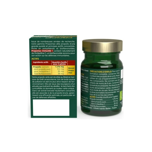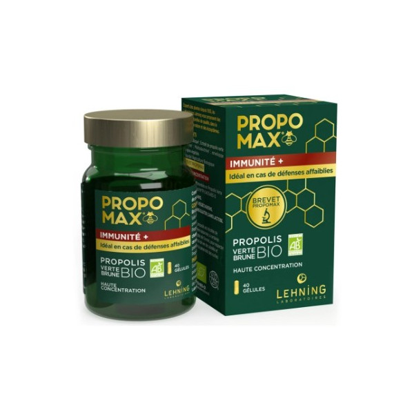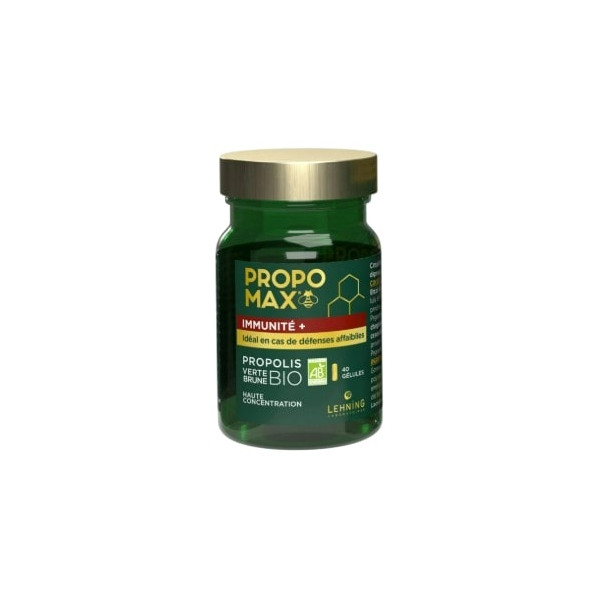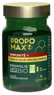 Propomax Immunité+ Bio x40 gélules des laboratoires Lehning est un complément alimentaire formulé à base d’un mélange exclusif d’extraits de propolis brune et verte biologique. Il est indiqué pour renforcer le système immunitaire en cas d’affaiblissement des défenses naturelles de l’organisme et lors des transitions saisonnières.