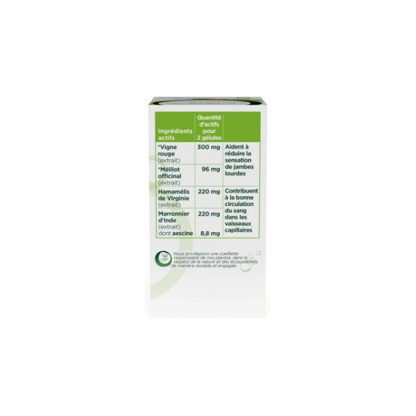 Riche en anthocyanes et en tanins, la vigne rouge renforce la résistance des capillaires sanguins, tandis que l’hamamélis se caractérise par sa forte teneur en polyphénols pour exercer une action veinotonique. Le marronnier d’Inde, quant à lui, doit son efficacité à l’æscine dans sa composition qui peut améliorer la tonicité veineuse. Le mélilot complète la formulation de ce supplément en soulageant les gonflements et en favorisant un retour veineux plus fluide.