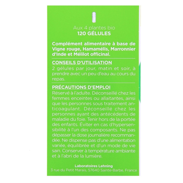 Extrait de vigne rouge (Vitis vinifera) (feuille) ; Extrait d’hamamélis de Virginie (Hamamelis virginiana) (feuille) ; Extrait de marronnier d’Inde (Aesculus hippocastanum) (graine) ; Extrait de mélilot officinal (Melilotus officinalis) (sommités fleuries) ; fibre de pomme ; enveloppe de gélule : hydroxypropylméthylcellulose.