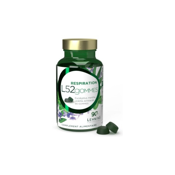 L52 Gommes du laboratoire Lehning est un complément alimentaire à base d'eucalyptus, menthe poivrée, échinacée pourpre et violette odorante. Il offre une fraîcheur immédiate pour faciliter la respiration, adoucir la gorge en cas d'irritation et aider à soutenir le système immunitaire.