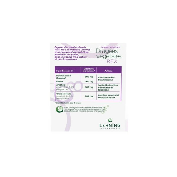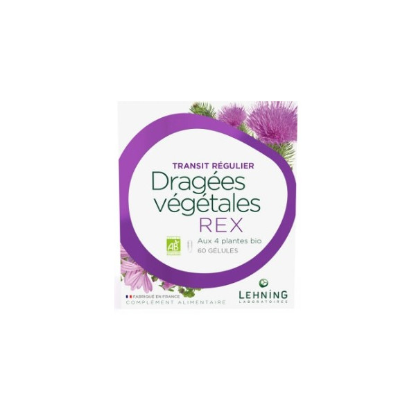 Dragées Végétales Rex Bio du laboratoire Lehning est un complément alimentaire à base de 4 plantes bio pour favoriser un transit régulier.