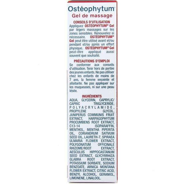 Développé par les laboratoires Trois Chênes, Osteophytum Gel est un produit de massage favorisant la souplesse et le confort des muscles et articulations. De plus, il apaise et détend en cas de raideurs, de tensions, voire de douleurs. Compte tenu de ces vertus, il convient plus particulièrement aux sportifs. Ces derniers pourront s’en servir aussi bien pour la préparation çà l’effort que pour la récupération.