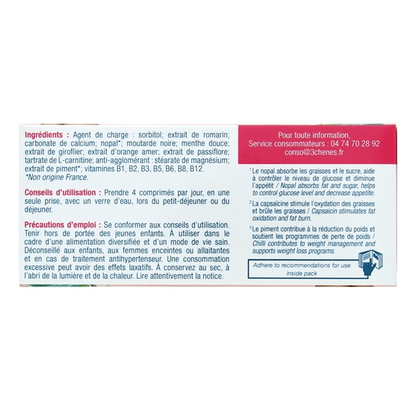 Agent de charge : Sorbitol, Extrait de romarin, Carbonate de calcium, Nopal, Moutarde noire, Menthe douce, Extrait de giroflier, Extrait d'orange amer, Extrait de passiflore, Tartrate de L-carnitine, Anti-agglomérant : Stéarate de magnésium, Extrait de piment, Vitamines B1, B2, B3, B5, B6, B8, B12.