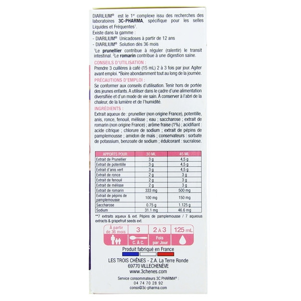 Pour vous, le laboratoire Les 3 Chênes a élaboré le Diarilium Enfants Solution Selles. Indiquée en cas de selles liquides et fréquentes, cette solution ralentit le transit intestinal tout en assainissant le système digestif. Elle doit ses vertus aux principes actifs tirées de plusieurs plantes.