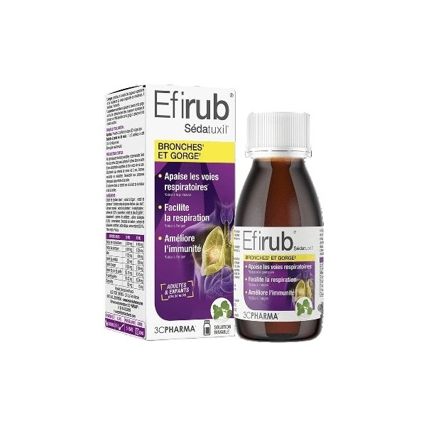 Efirub Bronches & Gorge du laboratoire les Trois Chênes est une solution buvable indiquée pour apaiser les voies respiratoires, faciliter la respiration et améliorer l'immunité.