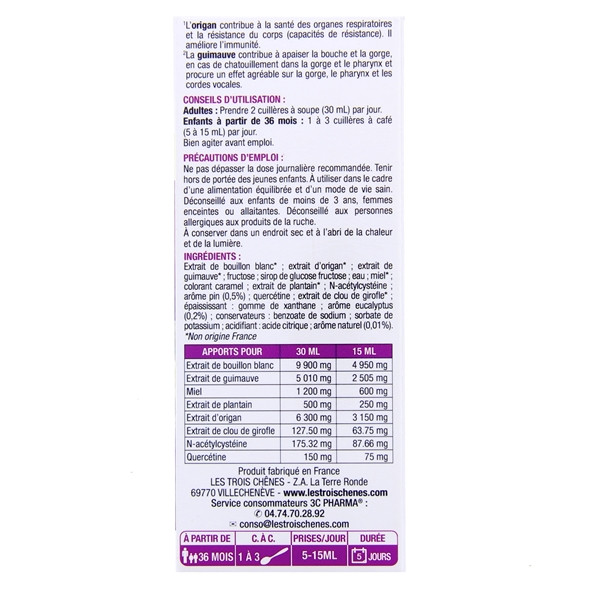 Extrait de bouillon blanc*, Extrait d’origan*, Extrait de guimauve*, Fructose, Sirop de glucose fructose, Eau, Miel*, Colorant caramel, Extrait de plantain*, N-acétylcystéine, Arôme pin (0,5 %), Quercétine, Extrait de clou de girofle*, Épaississant : Gomme de xanthane, Arôme eucalyptus (0,2 %), Conservateurs : Benzoate de sodium, Sorbate de potassium, Acidifiant : Acide citrique, Arôme naturel (0,01 %).
