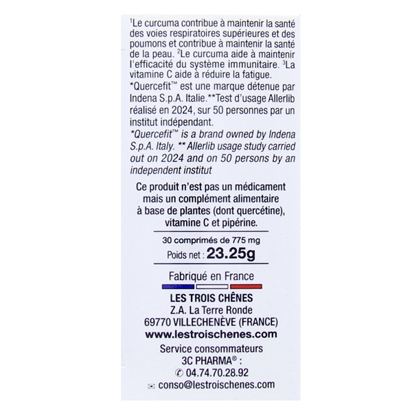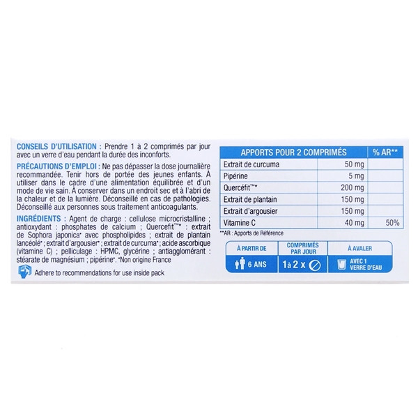 AGENT DE CHARGE : CELLULOSE MICROCRISTALLINE ; ANTIOXYDANT : PHOSPHATES DE CALCIUM ; QUERCEFIT™* : EXTRAIT DE SOPHORA JAPONICA AVEC PHOSPHOLIPIDES ; EXTRAIT DE PLANTAIN LANCEOLE ; EXTRAIT D’ARGOUSIER ; EXTRAIT DE CURCUMA ; ACIDE ASCORBIQUE (VITAMINE C) ; PELLICULAGE : HPMC, GLYCERINE ; ANTIAGGLOMERANT : STEARATE DE MAGNESIUM ; PIPERINE.