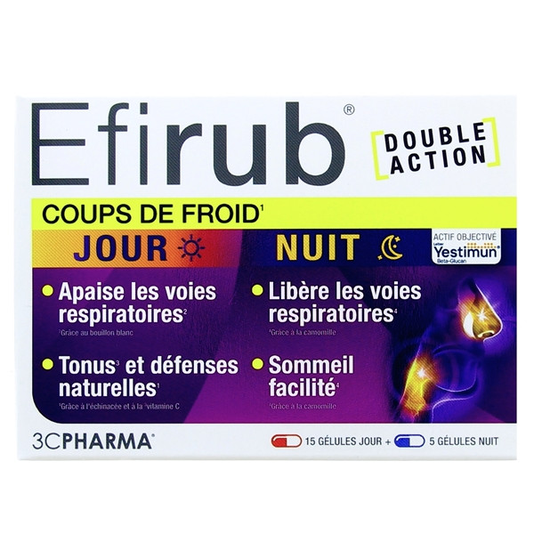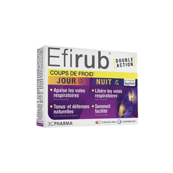 3C Pharma Coups de Froid Efirub Jour & Nuit est une complémentation disponible sous forme de gélules pour une utilisation en journée et de comprimés pour la nuit. Grâce à sa formulation spécifique, il exerce simultanément plusieurs actions sur les symptômes des coups de froid. La synergie des propriétés de l’échinacée, du pin sylvestre, de l’acétyle-cystéine et de la vitamine C permettent de préserver le dynamisme, le fonctionnement du système immunitaire et amenuise la fatigue pendant la journée. Le bouillon blanc et l’Yestimum® améliorent le confort respiratoire et contribuent à l’adoucissement des maux de gorge. Durant la nuit, la camomille et l’eucalyptus accélèrent l’endormissement. Conditionnement : boîte contenant 15 gélules Jour et 5 comprimés Nuit.