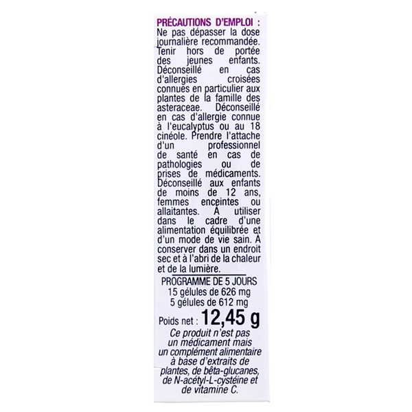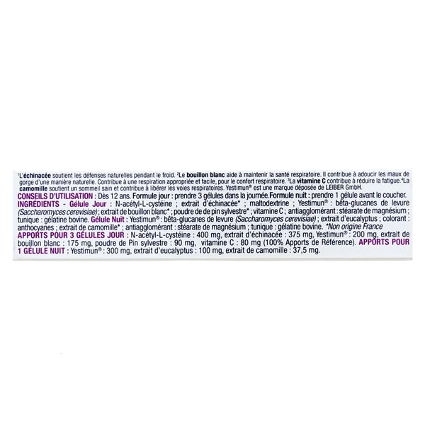 Gélule jour : N-acétyl-Lcystéine - extrait de curcuma - extrait d'échinacée - Yestimun - bêta-glucanes de levure - extrait de bouillon blanc – vitamine C - maltodextrine - poudre de pin sylvestre - antiagglomérant : stéarate de magnésium.