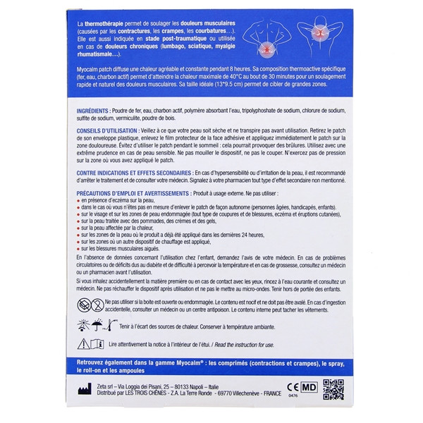 Les Patchs Myocalm Douleurs Musculaires du laboratoire 3C Pharma sont indiqués pour soulager par chaleur diffuse les douleurs musculaires au niveau du dos, des cervicales et des lombaires. Elles permettent d'apaiser les contractures et les tensions.