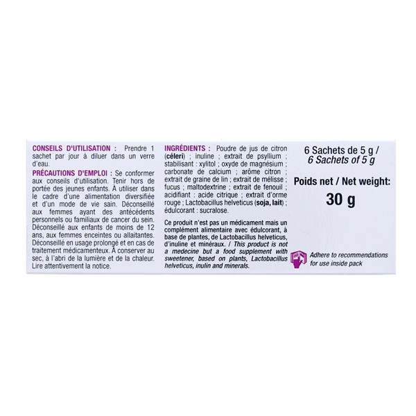 Poudre de jus de citron (céleri), inuline, extrait de psyllium, stabilisant : xylitol, oxyde de magnésium, carbonate de calcium, arôme citron, extrait de graine de lin, extrait de mélisse, fucus, maltodextrine, extrait de fenouil, acidifiant : acide citrique, extrait d’orme rouge, lactobacillus helveticus (soja, lait), édulcorant : sucralose.