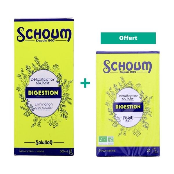 Schoum Digestion en solution de 500 ml + Schoum Digestion en tisane Bio avec 20 sachets offerte est un duo idéal pour la digestion, la détoxification du foie et l'élimination des excès.