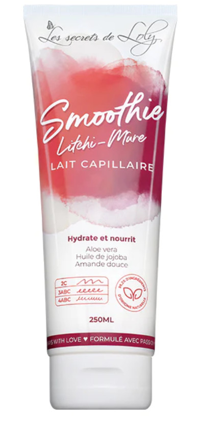 Smoothie Litchi-Mure Lait capillaire Les secrets de Loly est un soin capillaire riche et onctueux. Parfum Fruité. Convient à tous les types de cheveux texturés. Le lait apporte nutrition, hydratation et douceur au quotidien.