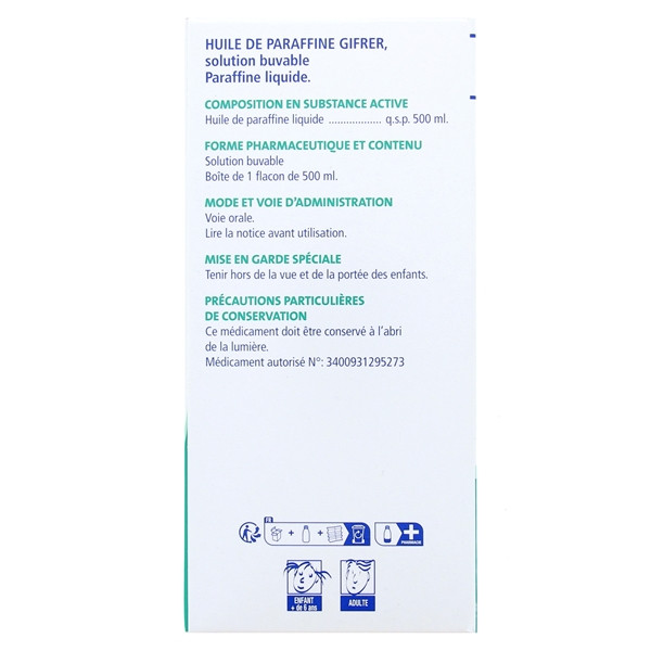 Huile de paraffine de Gifrer est disponible en flacon de 500 ml.