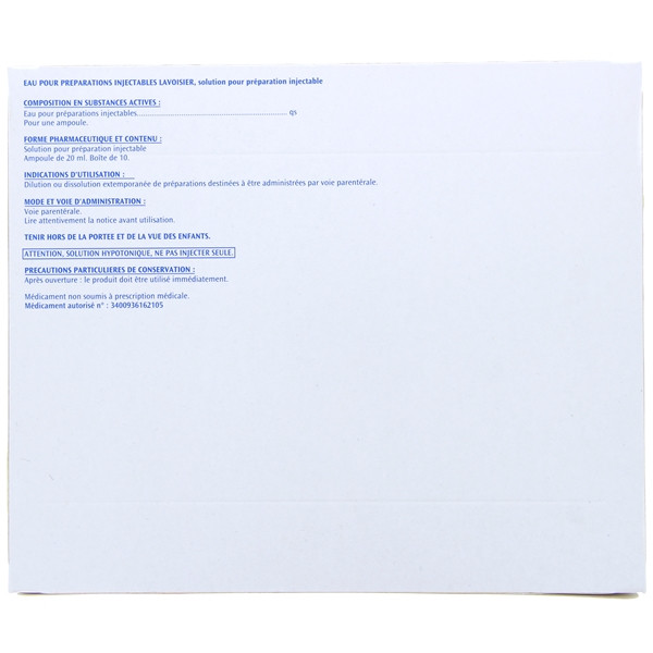 L'injection d'eau pour préparation injectable par voie intraveineuse peut être responsable d'une hémolyse si celle-ci est administrée seule.