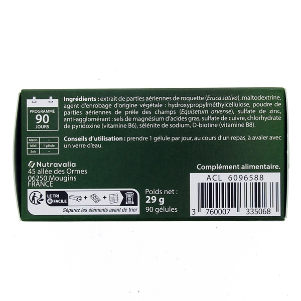 Extrait de partie aérienne de roquette (Eruca sativa), maltodextrine, hydroxypropylméthylcellulose (enveloppe de la gélule d’origines végétales), poudre de partie aérienne de prêle des champs (Equisetum arvense), sulfate de zinc, antiagglomérant : sels de magnésium d’acides gras, sulfate de cuivre, chlorhydrate de pyridoxine (vitamine B6), sélénite de sodium, D-biotine (vitamine B8). Plantes : origine Europe et hors Europe.