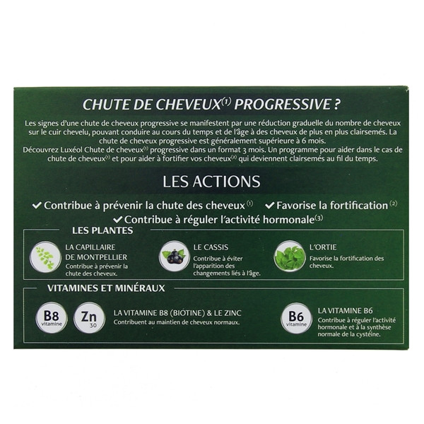 Luxéol chute de cheveux progressive est un complément alimentaire à base de capillaire de Montpellier, de courge, de cassis, d'ortie, de zinc, de vitamines B6 et B8. Il s'utilise en cas de chute de cheveux progressive liée à l'âge et au temps qui causent des cheveux de plus en plus clairsemés.