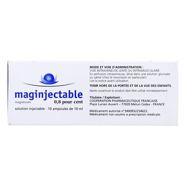 MAGinjectable 0,8 % est disponible en boîte de 10 ampoules de 10 ml.