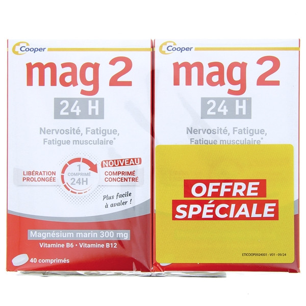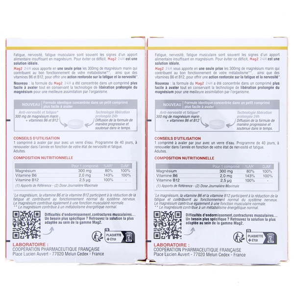 Le complément alimentaire Mag 2 24 H est formulé à base de magnésium 300 mg, de vitamine B6 et vitamine B12 pour lutter contre la nervosité, la fatigue et la fatigue musculaire.