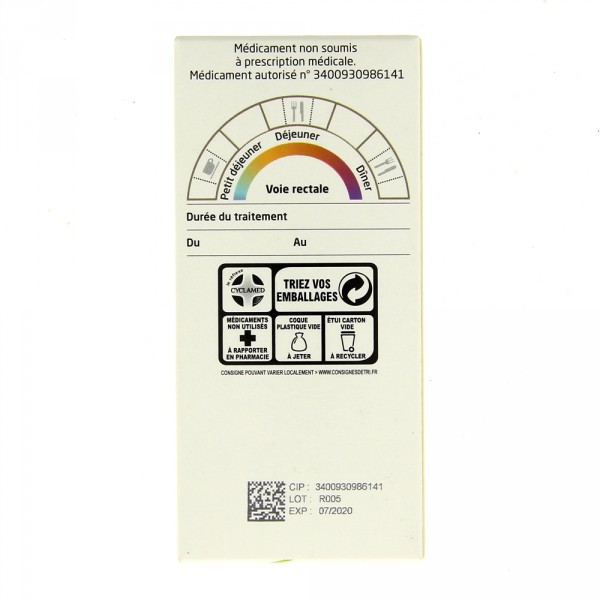- Adulte : 1 suppositoire, 1 à 3 fois par jour en respectant un intervalle minimum de 2 heures entre chaque prise.